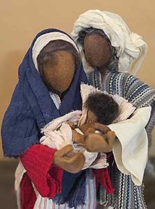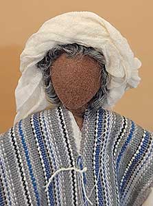 | Figur komplett mit Kleidung Sarah in einem aufwendig handbesticktem Kleid. Das Kopftuch ist umrandet mit kleinen Perlen. |