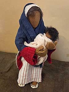 | Figur komplett mit Kleidung Sarah in einem aufwendig handbesticktem Kleid. Das Kopftuch ist umrandet mit kleinen Perlen. |